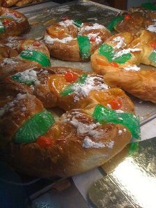 Known also as roscón de reyes, this is an especially colorful pastry that is usually consumed on January 6th, the day in which the Spanish people celebrate the Three Kings and when they exchange the gifts most of the world exchanges on Christmas. The tortel de reyes is a round, puffy pastry, usually filled with marzipan, covered in crystallized fruits and dried nuts. People know to bite carefully into each slice of the tortel, since somewhere in the pastry is either an uncooked fava bean, a ceramic figure or something else hard. The person who is lucky enough to get the slice with this treat gets to be the one to buy the tortel the following holiday season.