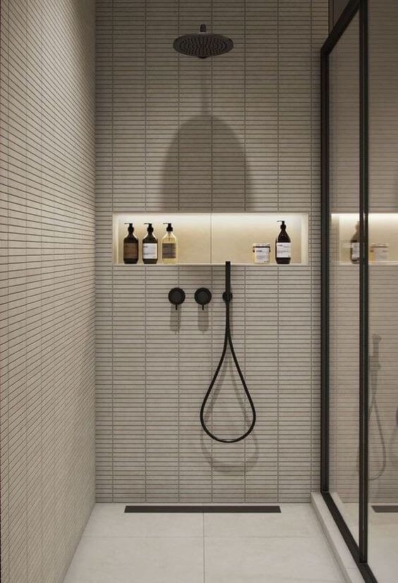- If your space allows, consider adding a shower wall a niche and built-in shelves to make a clever and dedicated space for your hygiene products.