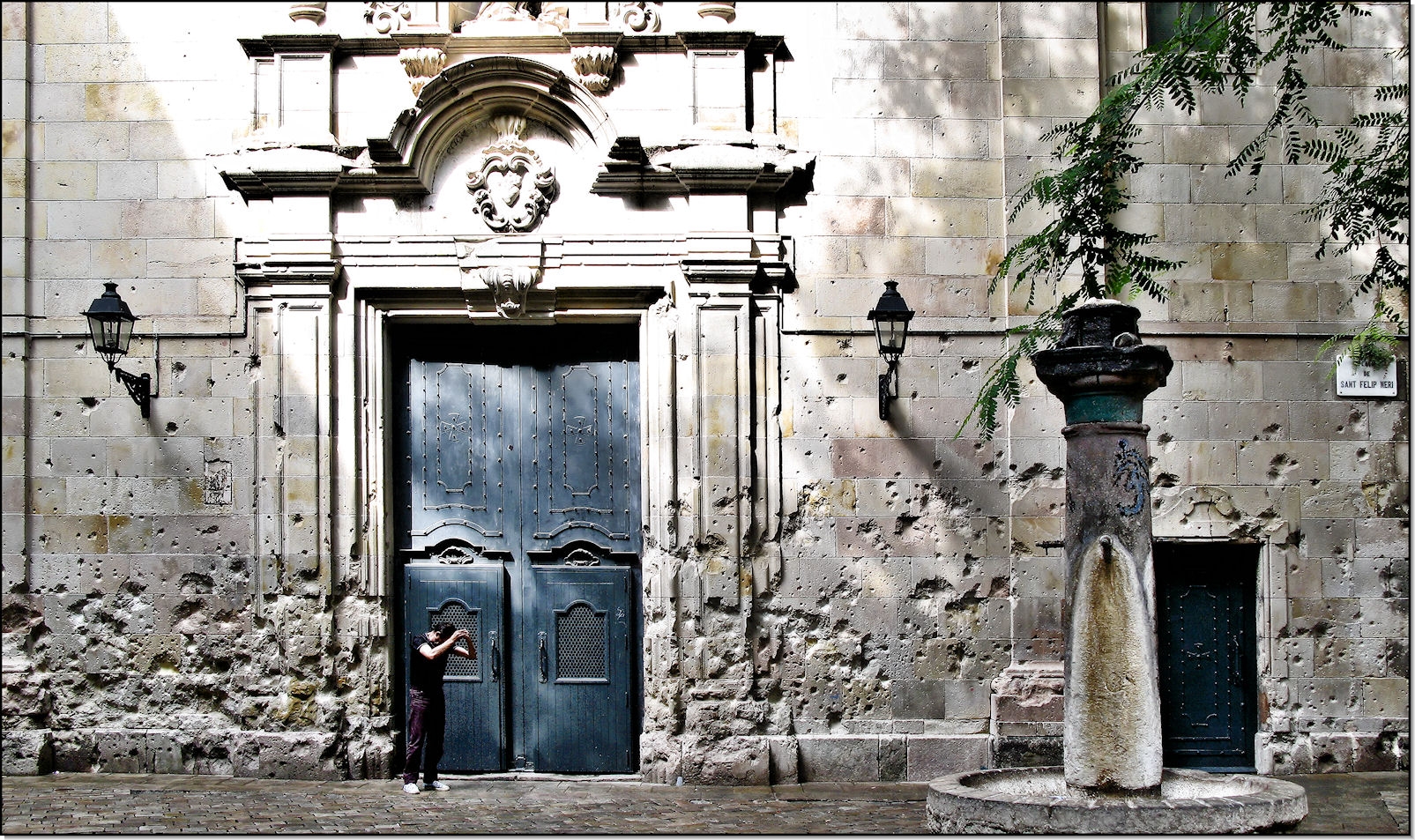 –The Façade of horror and tragedy in the church of Sant Felip Neri: this square from which we have spoken on other occasions, is somewhat hidden between the streets of the Gothic Quarter. On the facade of the church of the same name, you will see even the flaws that caused the shrapnel from a bomb during the heavy bombardment of January the 30th, 1938 in Barcelona during the Spanish Civil War. The bombing killed 42 people, mostly San Felip Neri school children.