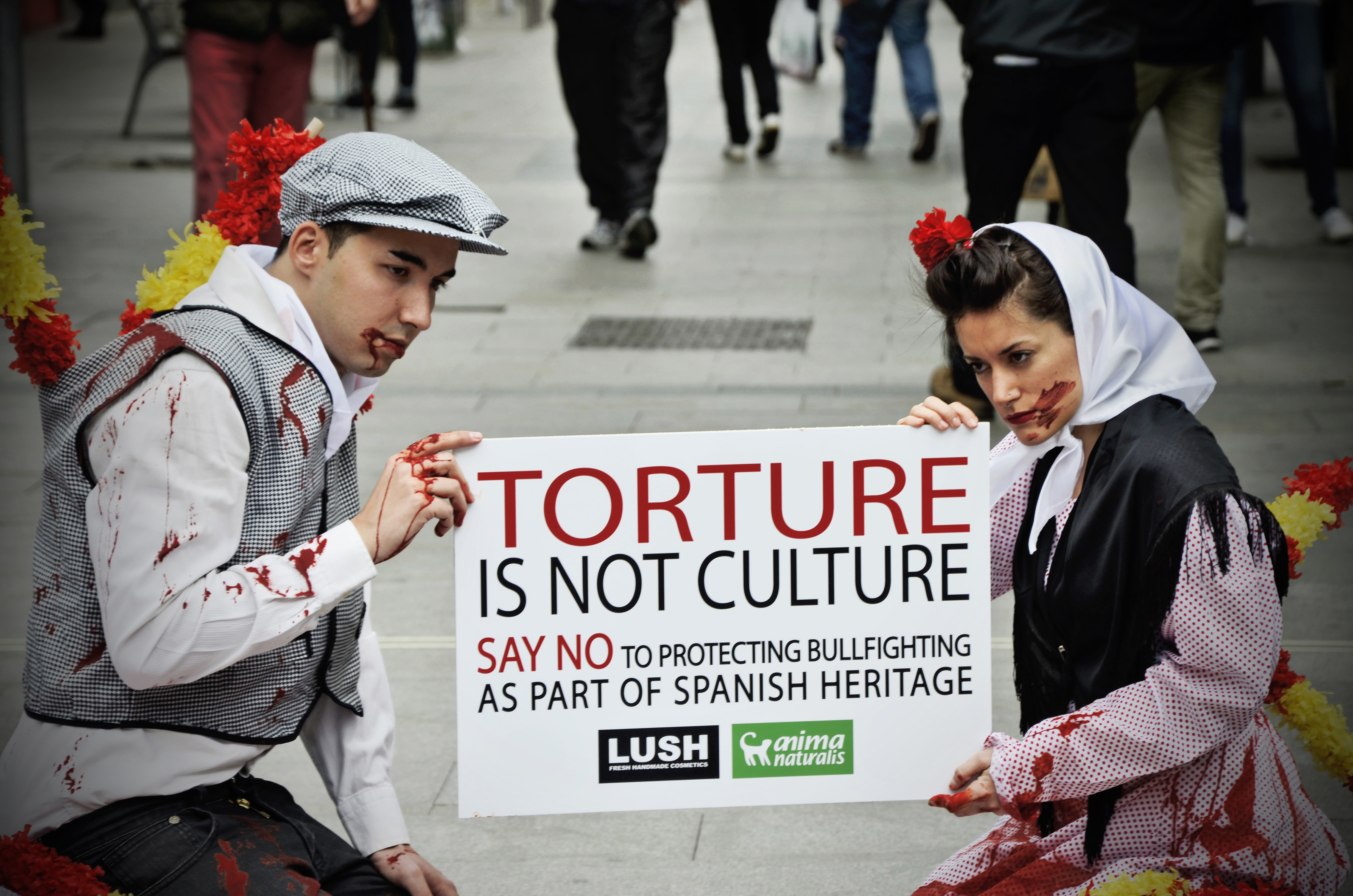 Anima Naturalis has performed a series of campaigns to make the public aware of the cruel ways humans treat animals, like their campaign against bull fighting, the use of leather and fur, the use of animals in circuses, seal clubbing, the selling of animals, and animal testing.