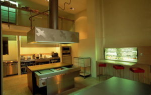 The bottom floor is divided into a kitchen and an office space. The kitchen is a mix of stainless steel and sleek wooden finishes. 250 bottles line one of the walls that are filled with spices, herbs and an array of flavours from all over the world. Other walls are covered in architect’s drawings of the proposed El Bulli Foundation, which is to open up later in 2014.