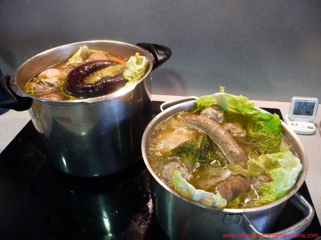For the broth you have to put all the meat in a pot with cold water, except the sausages and the minced meat. Boil it for one hour and add the chickpeas and after another hour add all the vegetables except the potatoes.