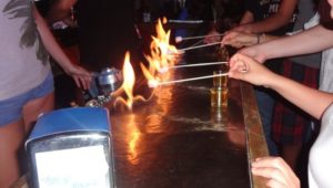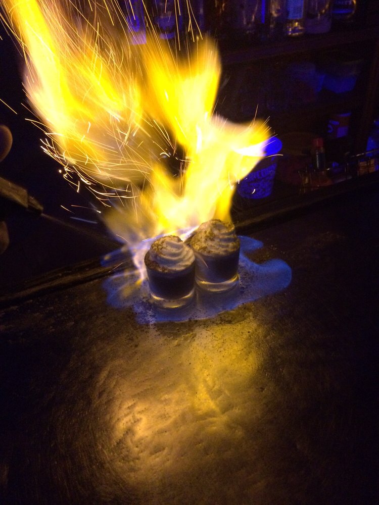 The shots are all very blatantly labeled and displayed behind the bar to see, however sans description which heightens the excitement for ordering a new shot. The Boy Scout comes complete with marshmallow on a stick that you can roast ON THE BAR after the bartender lights it on fire!?