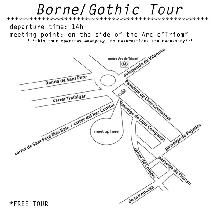 El Borne/El Gotico– This tour will take you throughout the neighborhoods of Born and the Gothic Quarter, displaying the historical richness of these power “barrios”, and even historical graffiti (it’s a thing)! The meeting is at 14:00 every day (Monday through Sunday), and it is not necessary to make a reservation in advance. However, if you decided to do a big group tour, I strongly advise reserving in advance to give your guide a proper warning. The meeting spot is at the Arc d’Triomf, usually lasts two and a half hours, and of course, is free.