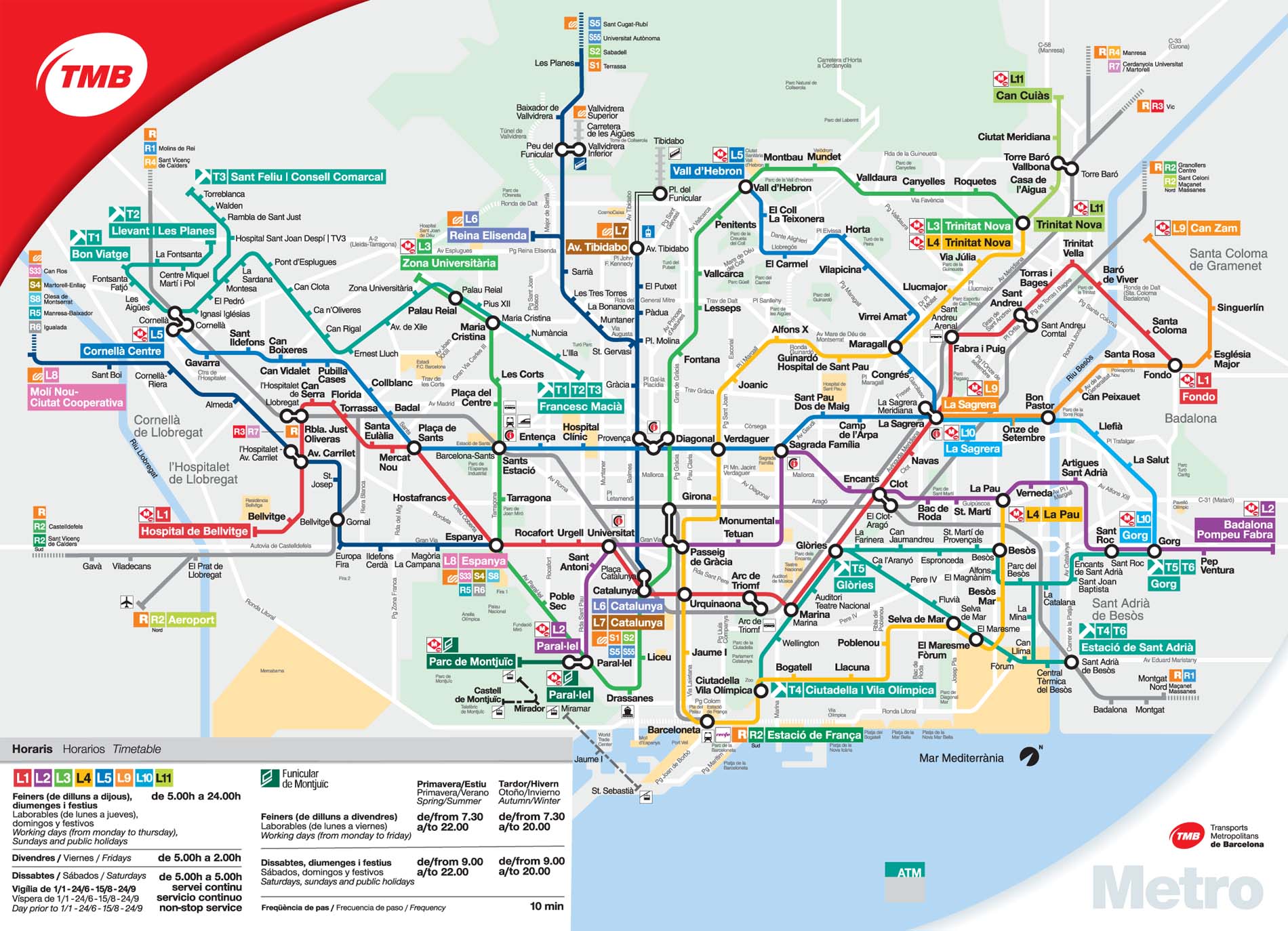 Barcelona and its surrounding towns have a good network of public transport: metro, train, buses, trams… You can find information in the TMB (Transports Metropolitans of Barcelona) website, where you find all the routes, timetables, combinations… The most used ticket is the T10, that gives you access to 10 trips in all forms of transport within the area (zone 1 is the metropolitan area and includes also some towns on the outskirts). You can change the means of transport using the same trip on the ticket if you do it within 75 minutes. This means you can travel by metro and change to train or bus with the same trip from the ticket if you do it in this time limit. The metro, the most used public transport, runs from 5am to 12 at midnight from Mondays to Thursdays and to 2am on Fridays. On Saturdays it runs all night. Be careful with pickpockets, especially in the centre area and when the metro is crowded! You also have night buses that run from 22:30 until 4:30am every 20 minutes. The FGC trains are also integrated in the network.