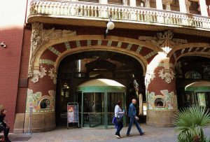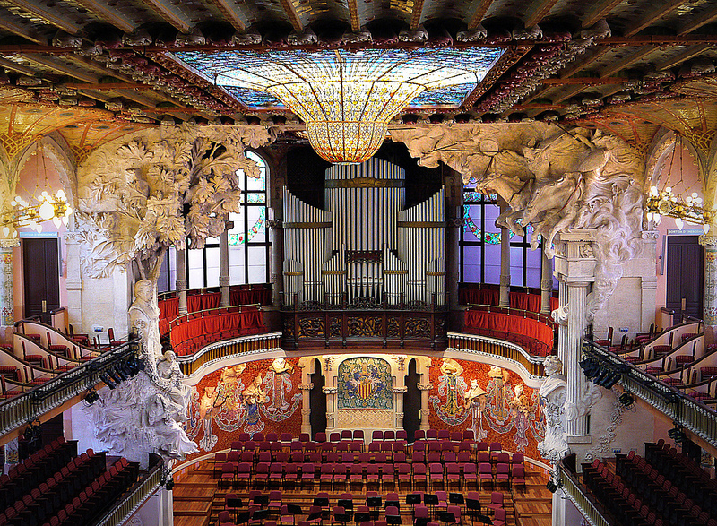 The Palau de la Música Catalana is a magnificent example of the Catalan modernist style, with a design that presents an abundance of curved lines and dynamic shapes, as well as a sumptuous decoration that uses a number of nature-related motifs. The Palau may be one of the most truly Catalan constructions there are in the city due to the fact that there was an express request made to the architect that he applied materials and techniques that represented the Catalan character. To make sure that he fulfilled this request, Montaner hired a number of local craftsmen and artisans who crafted exquisite decorative, structural, ornamental and sculptural elements. The façade itself is one of the most stunning parts of the building, combining elements of both Spanish and Arabic architecture, being richly decorated, and mixing exposed brick with mosaics, iron, stained glass and glazed tiles. Inside, the concert hall is the must-see area of the building, decorated with massive sculptures, a gigantic pipe organ, and the most amazing skylight which is made completely out of stained glass, allowing the room to be illuminated only by sunlight during the day.