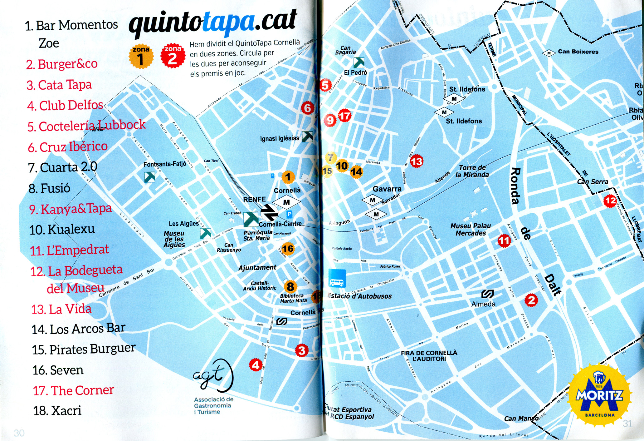 From the 30th of April to the 24th of May 18 bars around Cornellà offer the quinto-tapa deal, that is a Moritz quinto (20 cl bottle) and an elaborated tapa for 2.5€ or 3€. You have two different prices because you have two choices, between tapa de la casa or for 50 cents more the Km0 tapa, using local and high quality products. If you don’t like beer or don’t want to drink a lot, you can order water for the same price or wine or a soft-drink for 50 extra cents. To know the bars that offer the deal and the tapas they are serving you have a booklet and a map with all the information and photographs of all the tapas (you can also check the website). Make sure you also check for the times, not all tapas are offered all day long.