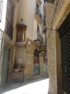 If you leave the square and go back to Sant Sever street, continue to your right before returning to Bishop Street. You’ll see that the street is narrower and it eventually goes down creating a descent, where it changes its name to Baixada Santa Eulalia (Santa Eulalia’s descent). In a small corner you’ll find a small altar with a sculpture of Santa Eulalia (co-patron saint of the city) and some candles and flowers. The history says that Santa Eulalia was put in a barrel with knives and thrown down this descent by the Romans as part of her 13 tortures for refusing to recant her Christianity.