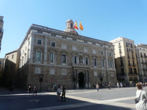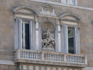 Continue under the bridge (any which way you want, that’s your choice) and you will end up in Sant Jaume square, that hosts the Town Hall and the Generalitat Palace (house of the Catalan government), one opposite the other. This square matches the old centre of the Roman city, where the two main streets in any Roman city (Cardo and Decumanus) crossed. The square takes its name from the Sant Jaume Church that was originally here, and that was demolished in the 19th century during the rebuilding of the square and Ferran street. The square, apart from being an important location for demonstrations, is also the venue for castellers. The two buildings are only open to visitors on special occasions, but you can have a look at the magnificent façades from any of the angles of the square. You’ll spot Sant Jordi killing the dragon in the balcony of the façade of the Generalitat Palace, a sculpture made during the 19th century.