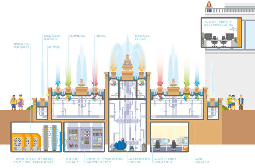 –The Francesc Vea i Estivill Pump Room: where are the pumps that “pump” water to 24 different water “games”, each with its shape, which can be used individually or combined. For example, one of the games is the central fountain that reaches up to 30 meters high. The source has a total of 3620 pumps which use 3100 cubic meters of groundwater. The light is provided by 4760 light bulbs passing through a prism of colors resulting in the spectacle that we see from outside.