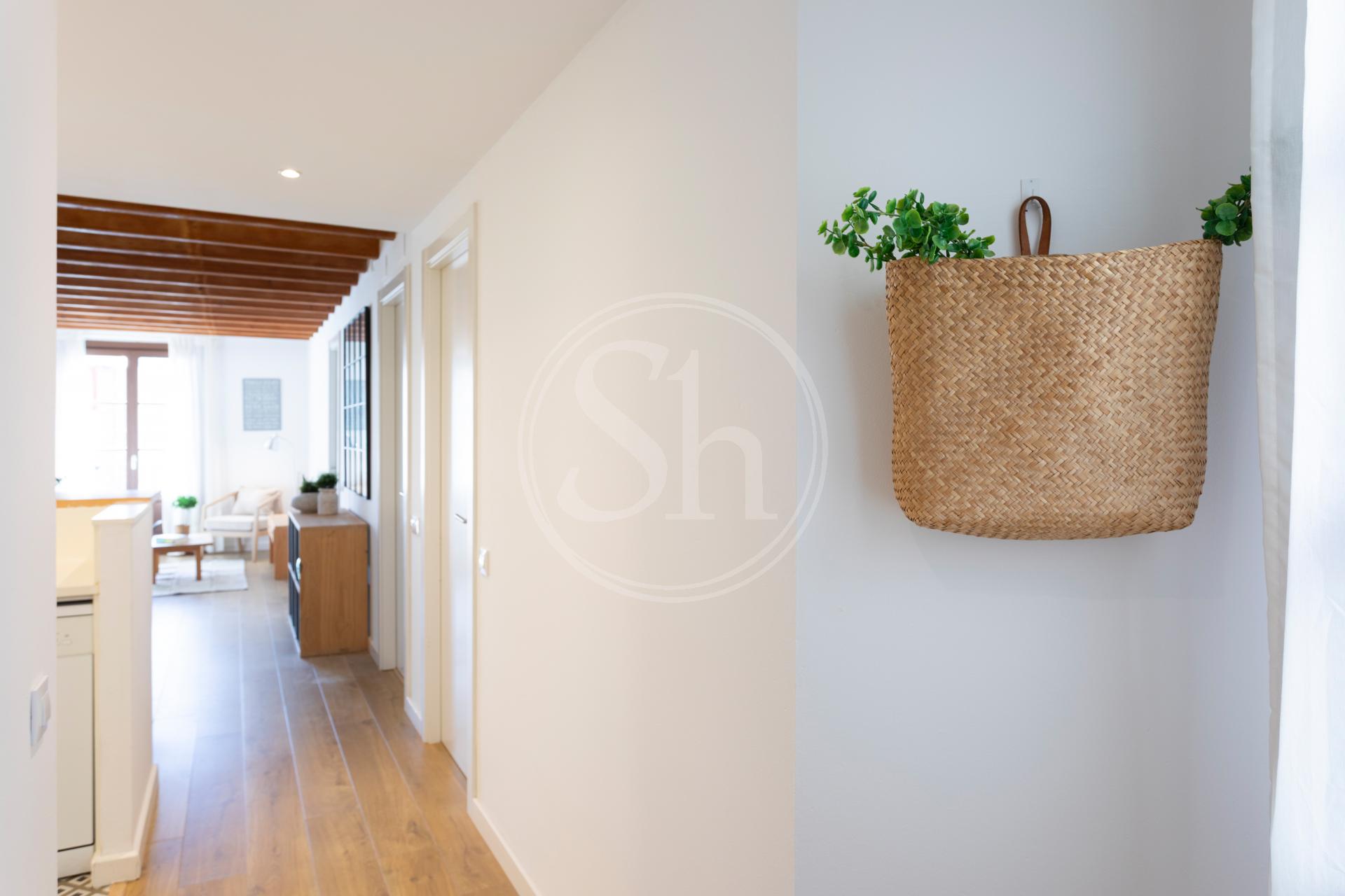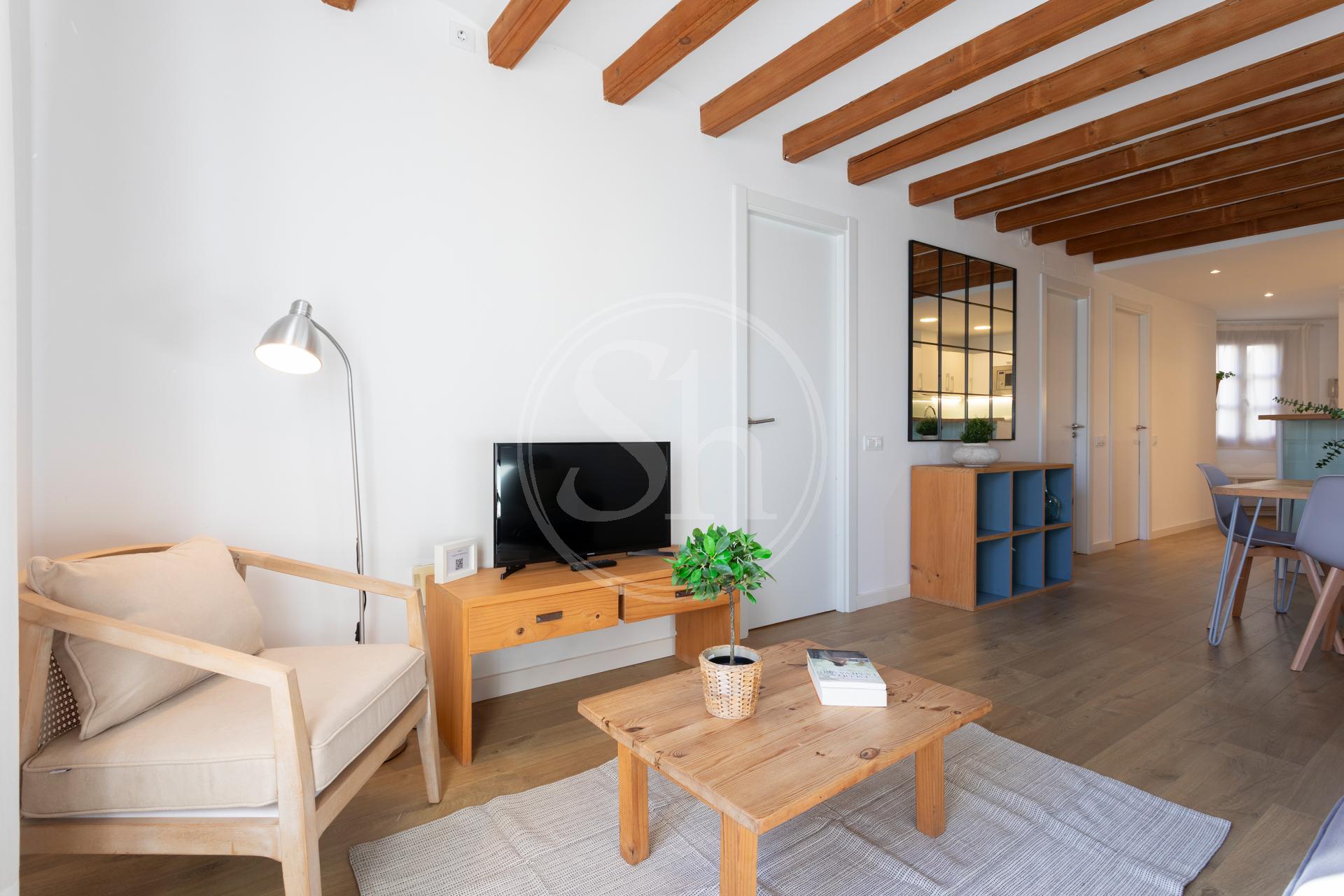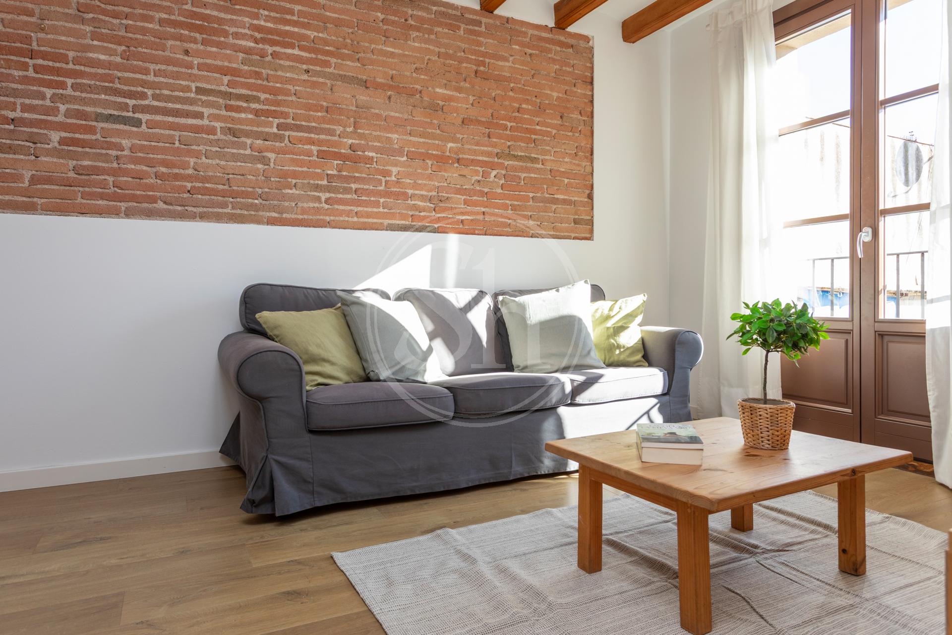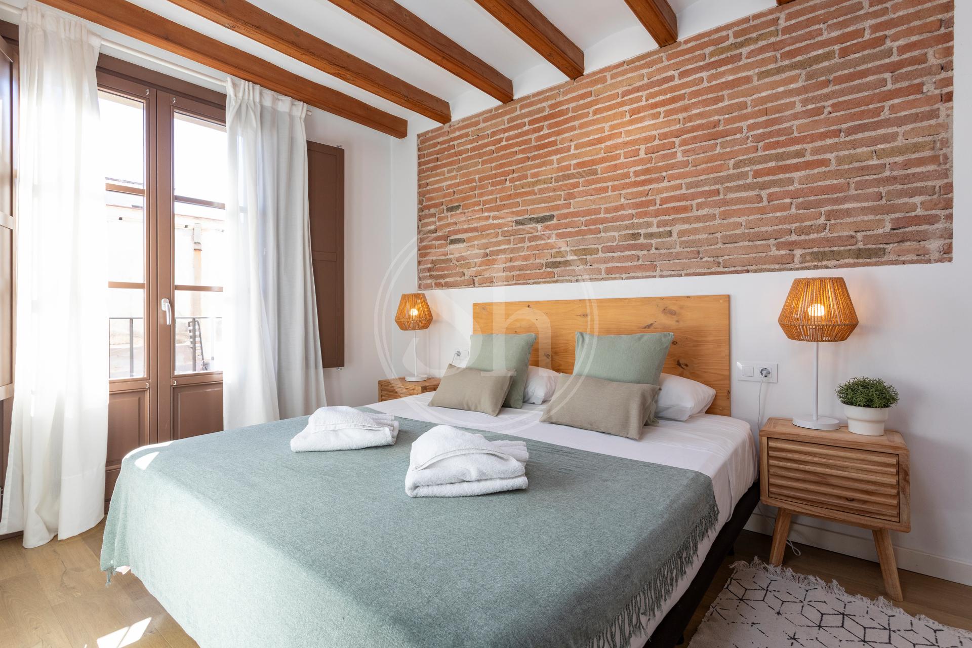 Charming flat with exposed brick walls and wooden beamed ceilings, offering two bedrooms and two balconies for rent in El Raval neighbourhood, Ciutat Vella district of Barcelona. Ideal for a group of friends or family, the flat is available to rent for a maximum of eleven months. The kitchen is fully equipped with dishwasher, oven, microwave and utensils, it has a cosy living room and two bedrooms which are nice and bright, tastefully decorated and furnished with fitted wardrobes. There is a modern bathroom and an independent laundry room. Internet connection and reversible air conditioning are included.