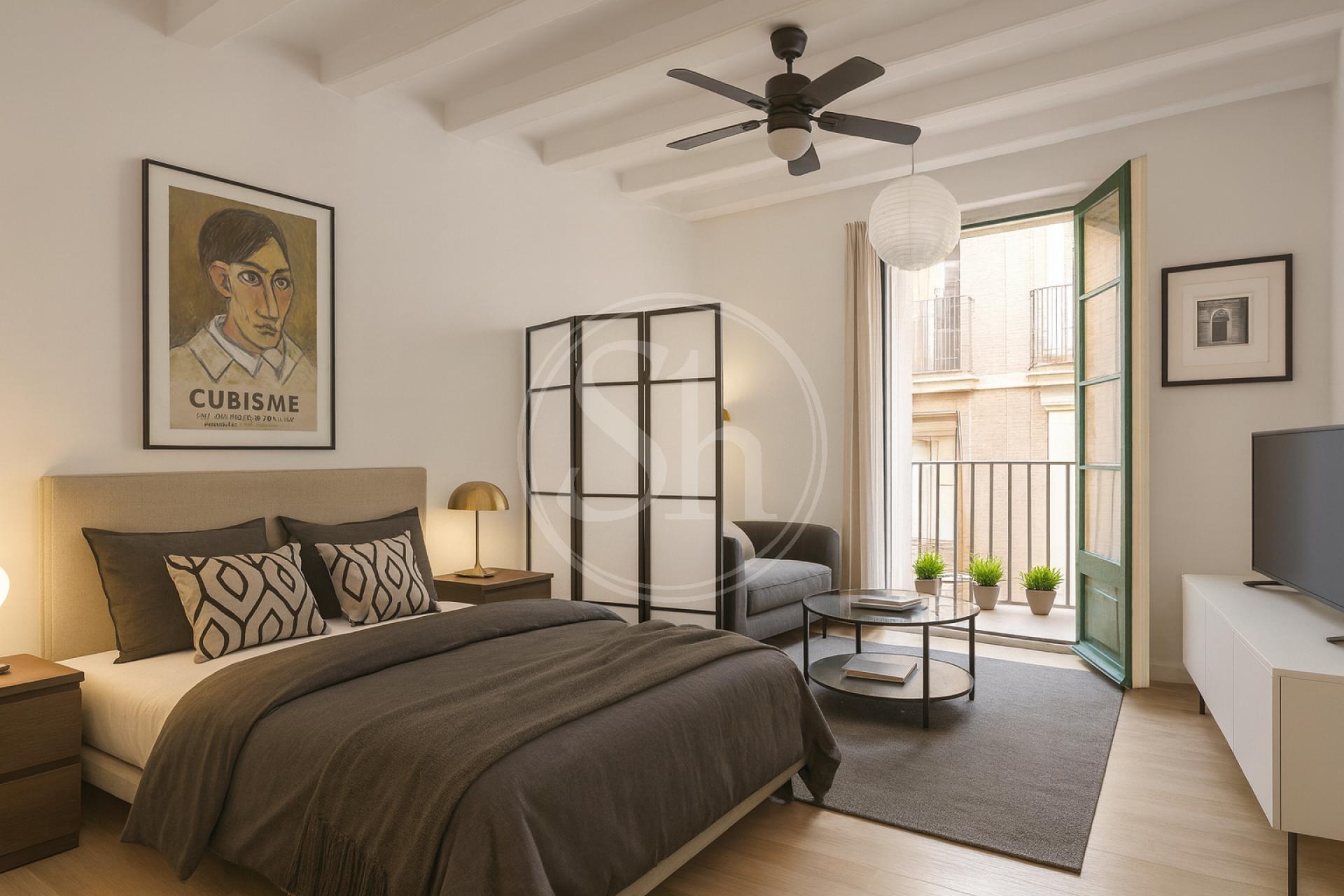 Comfortable studio flat available for monthly rental in the district of Ciutat Vella, Barcelona. Located in the historic Gothic Quarter. It has a bathroom, a large living room with dining room, desk and sofa bed, an independent kitchen equipped with all necessary utensils and appliances. It also has television, air conditioning, heating and double sofa bed, internet connection is included in the rental price.